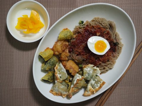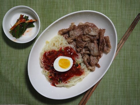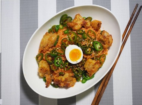 오른손으로 비비고 왼손으로 비비고 맛을 더하기위해 치킨과 오이고추를 곁들인 비빔면?