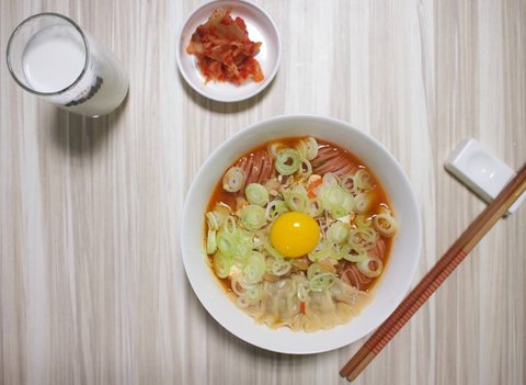 라면은 역시 국물이라며 클래식하게 만두를 넣고 파를 곁들여 계란 노른자를 올린 진라면 매운맛?