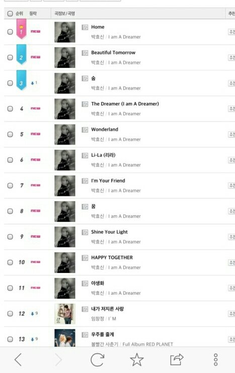 박효신도 절대 절대 무시못함 팬덤자체는 아이돌보단 좀 많이 약하지만 엄청난 대중픽임... 특히 야생화 뒤론 대중들이 그냥 믿고 듣는편 야생화는 이미 2억 스트리밍 넘겼고 야생화 발매하고 3년인가 연간차트 100위밖을 벗어난적도 없고 현재도 간간히 차트 인 하는 노래일 정도로 파급력이 너무 쎔... 가장 마지막으로 노래냈을때 당시 줄세우기 한 사진인데 저중에서 숨은 일주일전 선공개한거고 야생화는 무려 2년6개월전에 발매한건데도 줄세우기가 가능했음