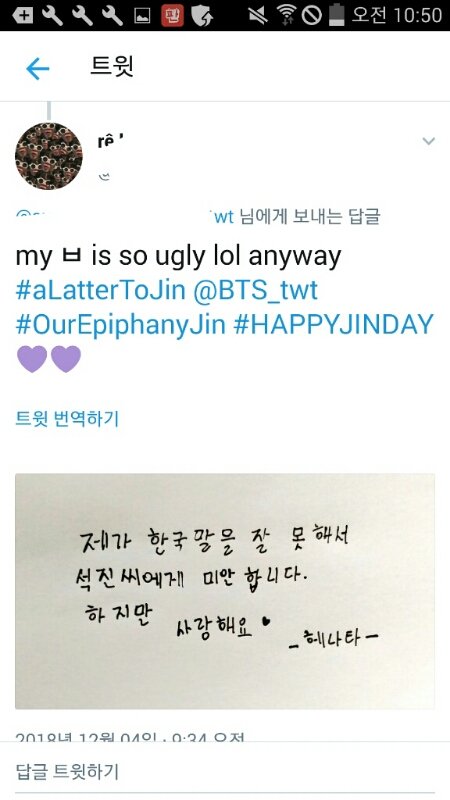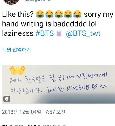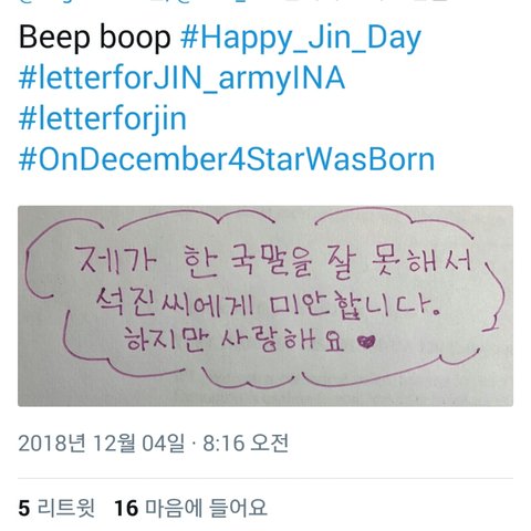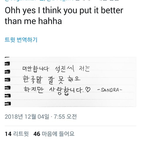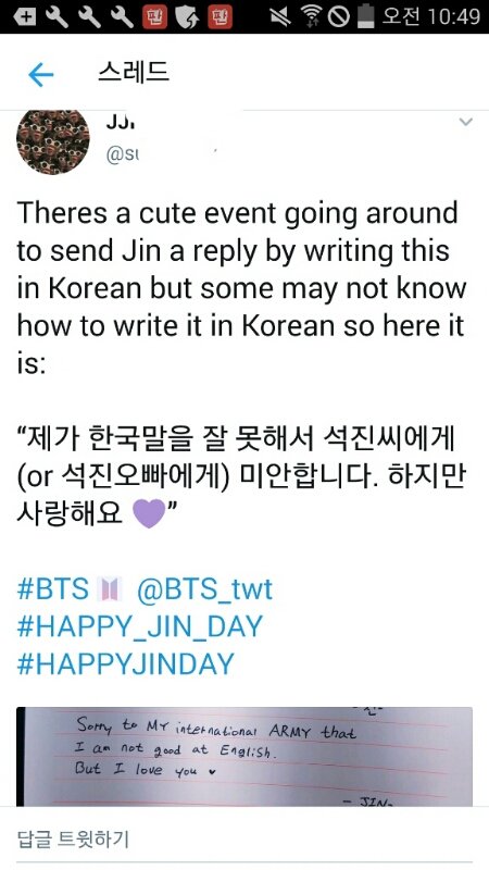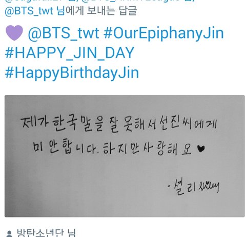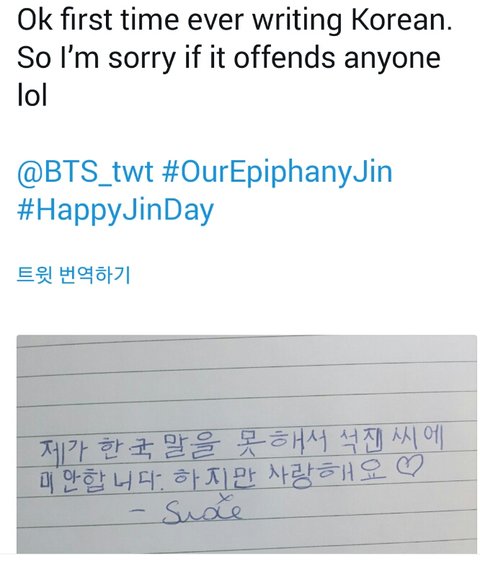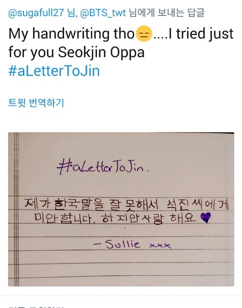 영어를 잘 못해서 미안하고 사랑한다는 석진이의 편지를 읽은 우리둥둥둥이들의 답장이야. 내가쫌 감수성풍부한가? 그냥 찡했어.. 새벽이였으면 울었을지도 몰러ㅠ 나만그런거 아니지?ㅠㅠ