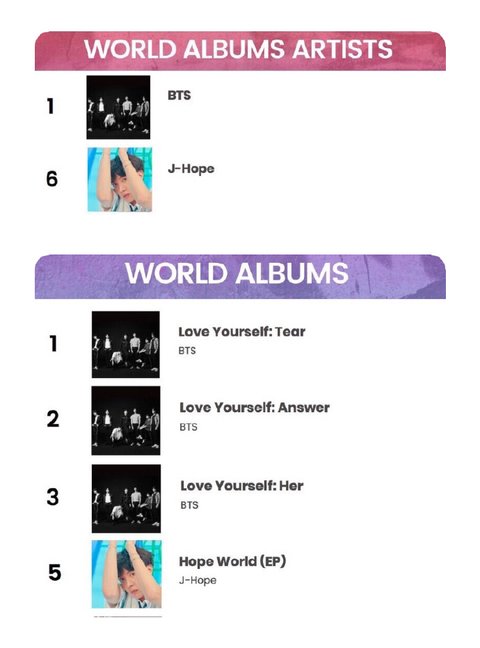 그리고 제이홉 믹스테잎 HOPEWORLD 월드앨범 차트 5위 월드 앨범 아티스트 6위. 진짜 최고!