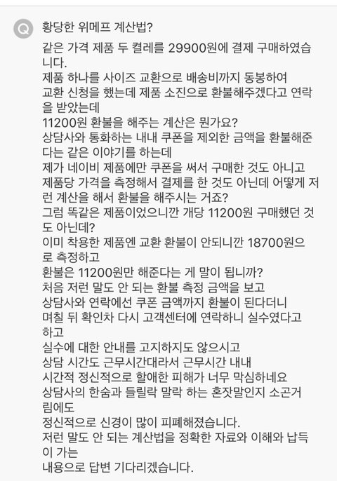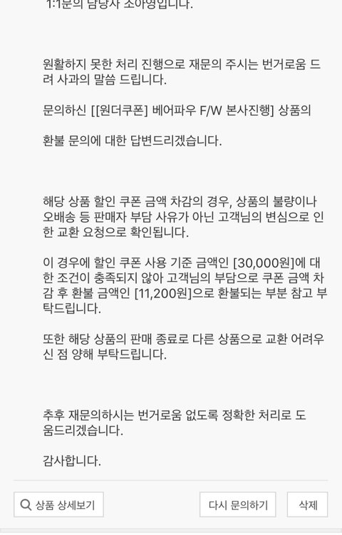 같은 제품을 하난 18700원에 구매하고 환불은 11200원만