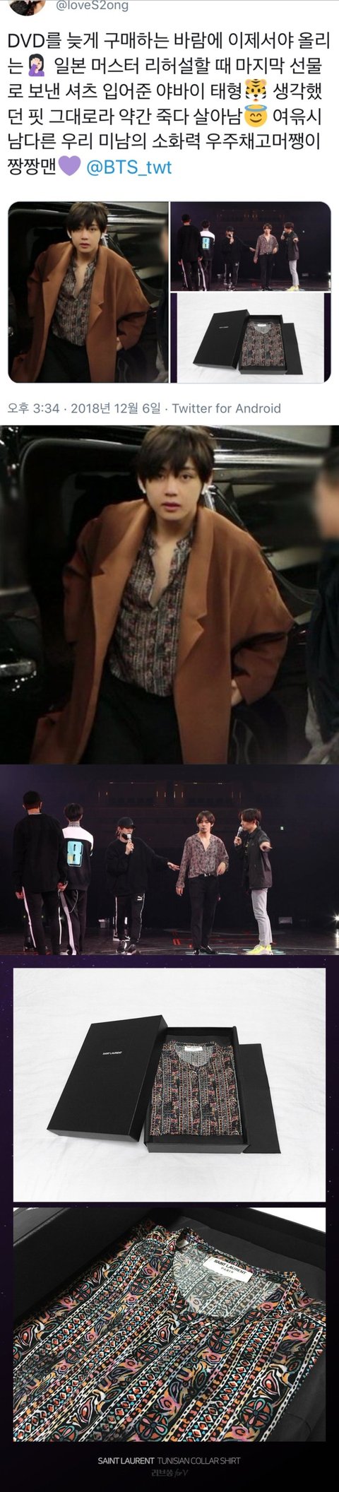 상체보수남 태형이가 웬일로 저렇게 열고다니나 궁금했는데 궁금증이 풀렸어ㅋㅋ 예쁜 셔츠 선물해주신 팬분의 안목에 감사