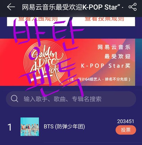 이거는 해당 국가 번호가진 사람들만 할 수 있어서 대륙제외 불가능한데 우리 지금 거의 4만표 차이로 1등 달리고 있음 큐티즈들 저 상 꼭 쥐어주고 받으면 다 흥분해서 울 거라고 하면서 자기 나라에서도 방탄이들 인기 많은 거 알아줬으면 좋겠다고 말하더라 우리도 열심히 잘 하자 ㅎㅇㅌㅎㅇㅌ