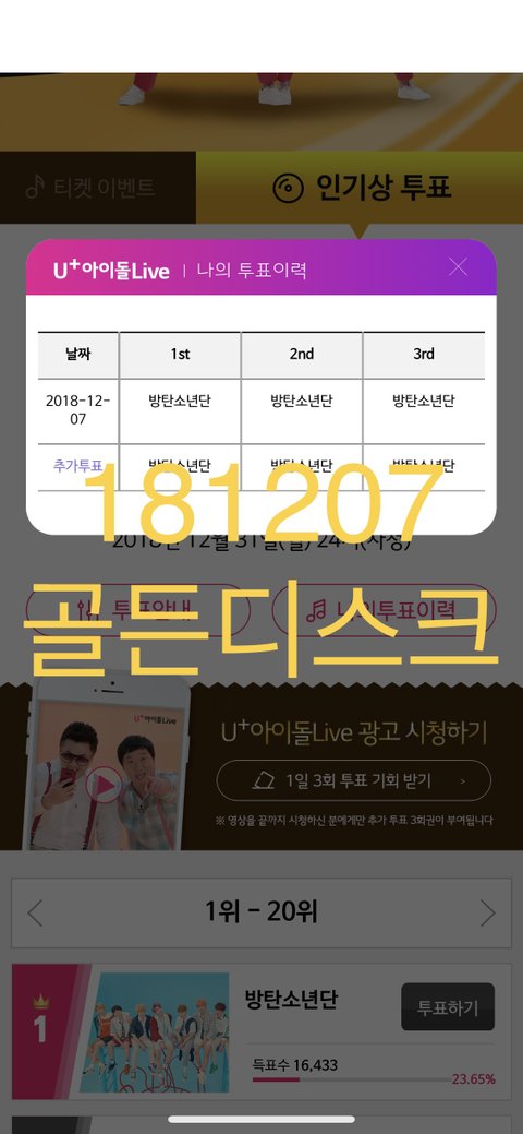 6번을 투표하고 1위이니 7개의 방탄소년단을 스샷가능함 뭔말인지 모르겠지? 나도 그래 그냥 한스샷에 우리만 담겼으면 좋겠단 말이다~~~~~