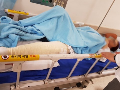 엄마는 왼쪽 골반에 골절소견이 있고 엉덩이부터 다리 전체가 피멍들고 깁스를 한 상태입니다.