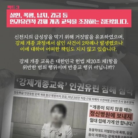 ■ 살인, 폭행, 납치, 감금 등 인권유린적 강제 개종 교육을 조장하는 집단입니다.
