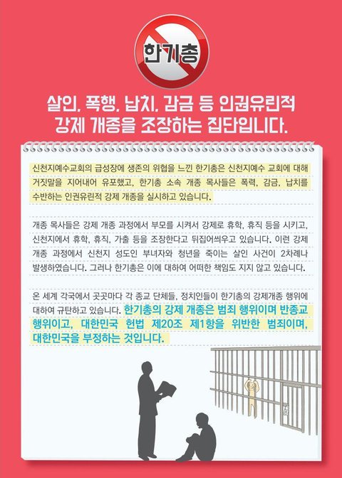 한기총의 강제 개종 교육은 범죄 행위이며 반종교 행위이고, 대한민국 헌법 제20조 제1항을 위반한 범죄이며, 대한민국을 부정하는 것입니다.