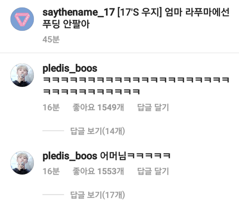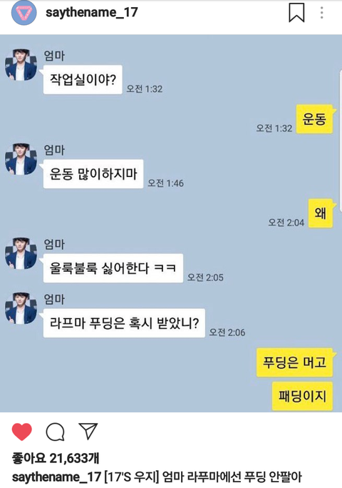 부승관 인스타 열심히함ㅋㅋㅋㅋ (우지 어머니께서 콘서트회식자리에서 승관이한테 우지는 사랑한다는말을 안 한다고 투정부리셨다고ㅋㅋ!! 열셋 가족들 너무보기좋다 ㅜ..ㅜ-)