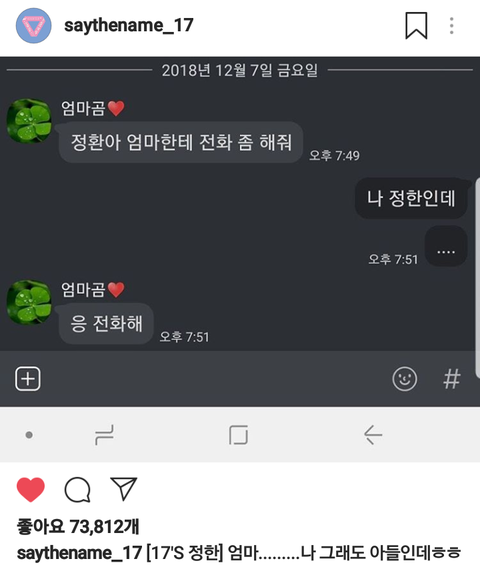 정환...ㅋㅋ 환이라고 치기가 더 어렵지않으셨는지..ㅋㅋㅋㅋㅋㅋㅋㅋㅋㅋㅋㅋㅋㅋ 엄마곰..ㅠㅠ (tmi - 정한이는 지금까지도 엄마와 여동생에게 볼뽀뽀를 해주는 다정한 큰아들..♡♡♡)