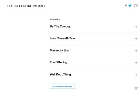 앨범 디자인상이긴한데.. 일단 우리나라 가수가 만든 앨범이 저기 노미됐다는것만으로 ㄹㅇ놀라운일임 그래미 생각보다 ㅈㄴㅈㄴㅈㄴ보수적이고 콧대높은 시상식맞는데 그 와중에 방탄앨범이 비록 디자인상일지라도 노미됐다는건 시상식측에서도 어느정도 방탄을 의식했다는거.. 그래미 뮤지엄가고 자꾸 그래미 공계에서 방탄 언급할때마다 낯설다.. 그래미왜저러지.. 생각했는데ㅋㅋㅋ..ㅠㅠ 진짜 어떤 방식으로든 노미된게 자랑스럽다ㅜㅜ