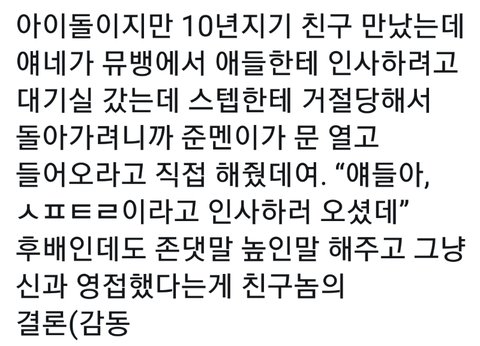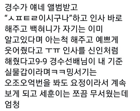따로 인증이 있는건 아닌데 애들은 스탭후기나 다른 신인들이 언급한 엑소 대기실 인사후기가 워낙 한결 같아서 ㄹㅇㅠㅠㅜㅠㅠㅠ
