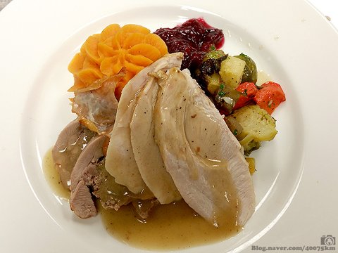 크렌베리 소스와 그레이비 소스를 곁들인 칠면조 요리. 고구마 퓨레가 함께 나옵니다.