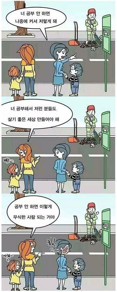 더기분나쁜데? 동정해주는척 무시하고있고 지가 일침거하게 날린줄아는태도 맘에안듬 환경미화가 뭐 어떤데 저런 분들라 칭하고 왜 저런분들이 살기좋은세상을 지들이 만들어야한다고 자식교육까지 동시에시키지? 개몽마인드 개같아ㅋㅋㅋㅋㅋ 걍 파헤쳐보면 저런 쓰레기나줍는 사람들이 그나마 살만하게 만들려면 너가 공부열심히해서 높은사람이 돼야 한다 이건디 뭔 ㅋㅋㅋㅋㅋ