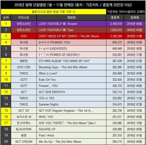 골디 거의 확정인듯 (2018 단일앨범 판매량 / 가온 기준)