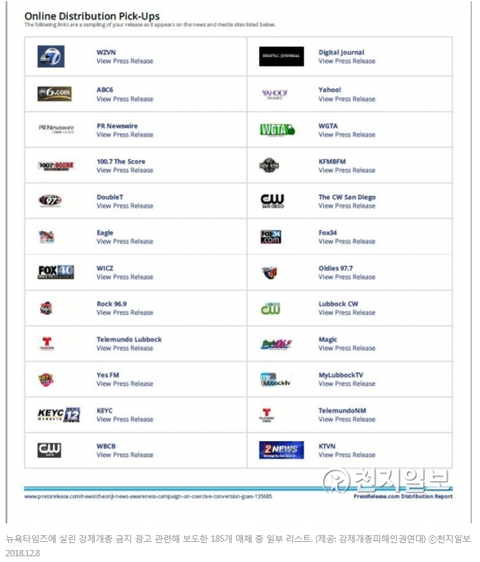 ABC(American Broadcasting Co.)6, CBS(colombia broadcasting syetem)8, FOX(Fox News Channel)34 등 해외 매체 185곳이 최근 뉴욕타임즈에 실린 ‘강제개종 금지’ 광고 내용을 기사화했다고 8일 강제개종피해인권연대(강피연)가 밝혔다.