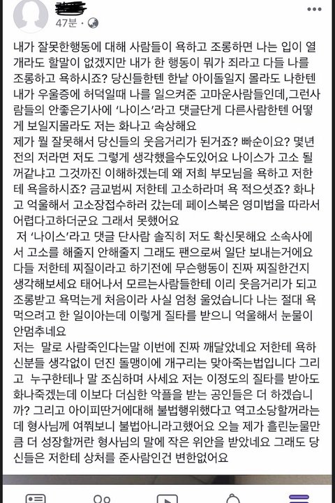방탄교통사고기사났는데 누가 댓글로 나이스라고 담->근데 방탄팬?이 피뎊따서 소속사에 보냈다고 댓글달았는데 그댓글이 좋아요 ㅈㄴ받았는데 다들 팬 조카 조롱하고있음..그사람이 글도 올렸는데 ㅈㄴ불쌍해... 저사람 잘못없다아님? 문제될까봐 가릴꺼가림