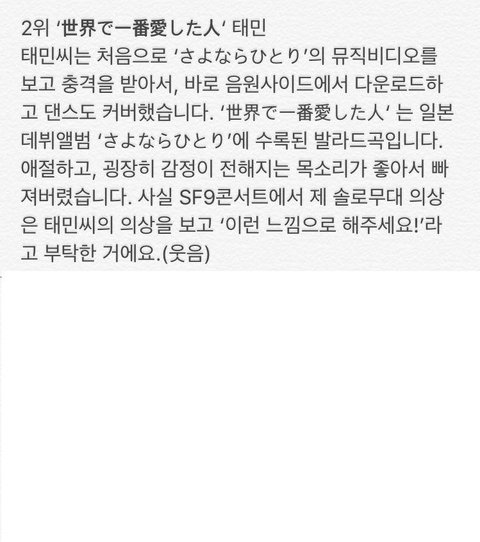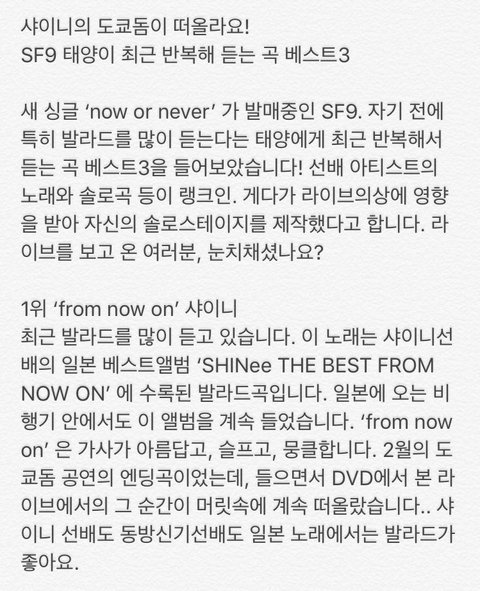 일본 인터뷰에서 반복해서 듣는 노래로 샤이니의 프롬 나우 온과 태민의 솔로곡을 꼽아줌. 콘서트에서 본인의 솔로무대 의상도 태민씨 의상에 영감받아서 한거라고 ㅋ