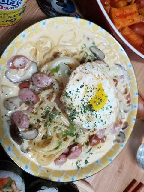 비엔나소시지나 햄, 베이컨 아무거나 있으시면 넣어주시구요. 우유 400ml정도를 붓고 빵집에서 생크림 팔거든요 그거 2통을 사서 다 넣어서 끓여줍니다. 그리고 취향에 맞게 치즈 2~3장을 넣고 소금 2꼬집 정도를 넣어요. 삶은 면을 넣어 졸여주고 계란후라이 반숙을 올려주면 맛있게 먹을수있어요. 쉽습니다 ~~