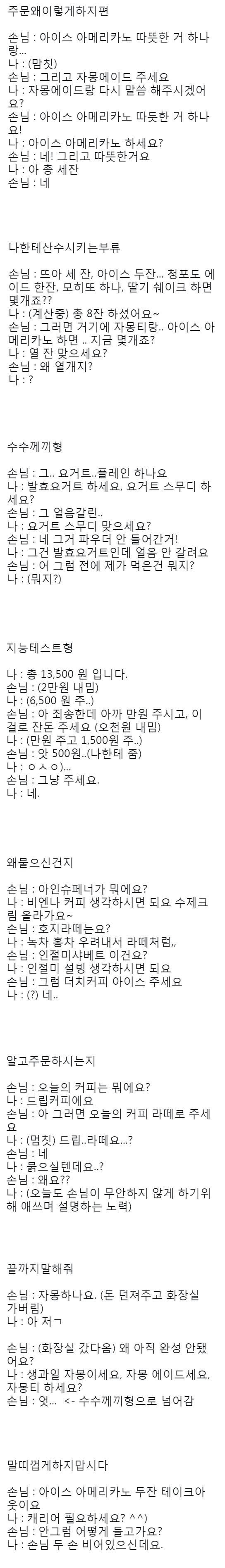 저기에 하나만 더 추가하자면, 주문할때 제발 딴짓좀 안했으면 좋겠음. 주문받을 때 여기서 먹고가는지, 적립은 하는지, 본인이 뭘 시켰는지 다 확인해야하는데 전화통화하고있고 이어폰끼고 있으면 그게 제대로 되긴함? 이런손님들은 오면 진짜 주문 받고싶지가 않음. 맨날 건성으로 고개 까닥거리면서 주문했다가 나중에 잘못됐다고 진상부림