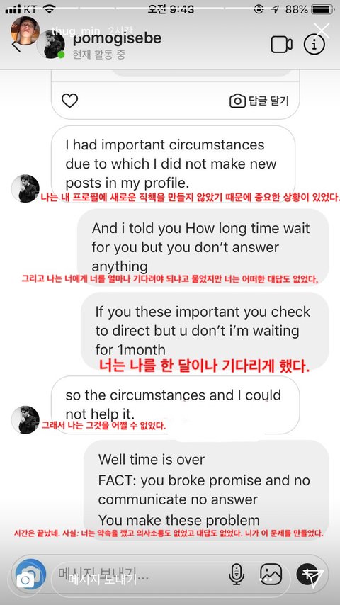 위에 해석한 거 보면 자기 뭐 상황 있어서 못봤다고 변명하는 내용인 듯...