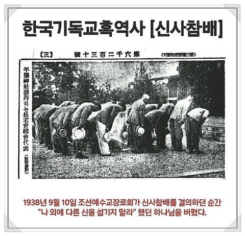 한국교회 보수진영의 역사 속 행태는 치욕스런 ‘만행’으로 평가되고 있다. 1884년 한반도에 첫 발을 내딛은 장로교는 반세기 만에 신앙의 정절을 저버렸다. 일제강점기인 1938년 9월 10일 조선예수교장로회는 ‘신사참배는 종교의식이 아니라 국가의식이다’라는 아전인수격 논리로 일제 천황신에게 참배할 것을 결의했다. 종교의식이 아니라던 신사참배는 결의 후 예배의 일환이 됐다.