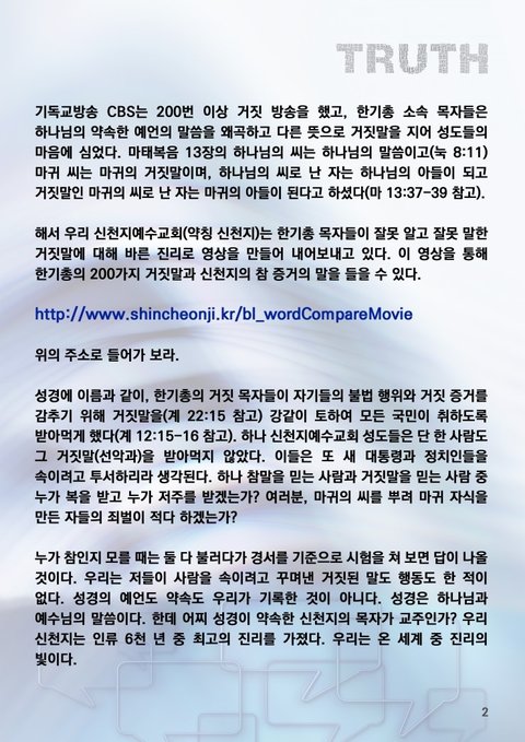 해서 우리 신천지예수교회(약칭 신천지)는 한기총 목자들이 잘못 알고 잘못 말한 거짓말에 대해 바른 진리로 영상을 만들어 내어보내고 있다. 이 영상을 통해 한기총의 200가지 거짓말과 신천지의 참 증거의 말을 들을 수 있다.