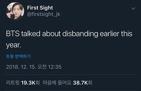 이글이 퍼지고나서 엄청난 알티수와 함께 외팬들의 혼란이 시작됨. disband 이단어만 쳐도 지금도 엄청난 수의 글들이 나오고있음. 다들 슬프다라는 반응보다 '방탄의 해체는 상상조차 해본적이 없어서 방탄없는내삶이 그려지지않는다'라는 반응이였어. 비교적 미국은 무조건적인 컴백없이 길게 공백기를 가지더라도 오래 활동하니까.