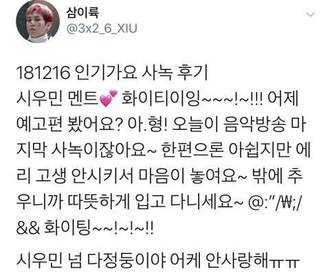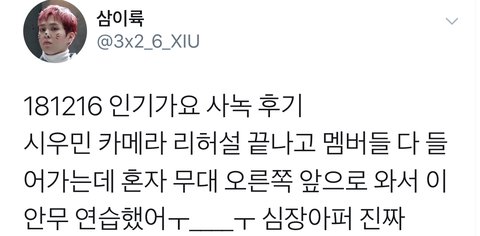 시우민 연습벌레에 킹왕짱 다정한사람ㅠㅠㅠ 근데 러브샷 막방 실화인가여?ㅠㅠㅠ 스엠 우리 요정님 얼굴 더 보게 해주라규ㅠㅠㅠ