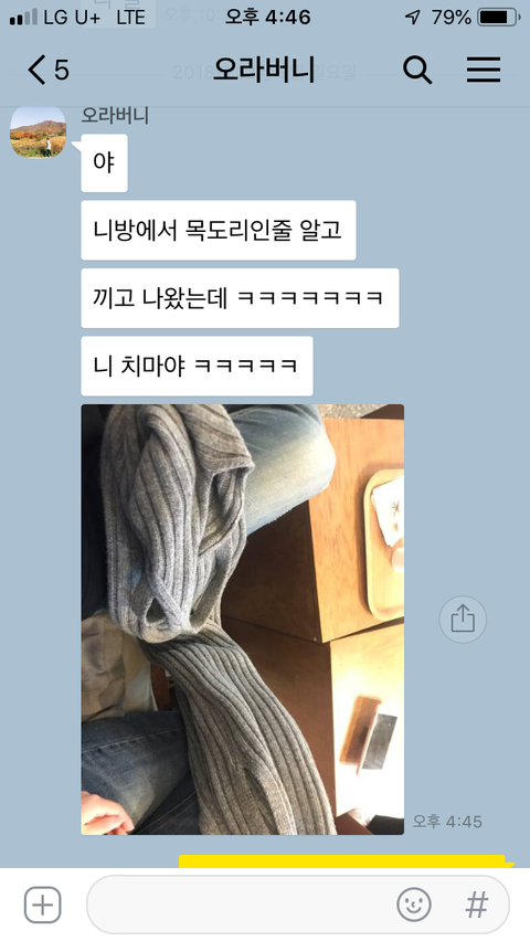 보통 평소에 오빠가 제 방에서 제 목도리를 훔쳐 두르고 나가곤 해요 . 그러던 어느날 이렇게 카톡이 왔어요