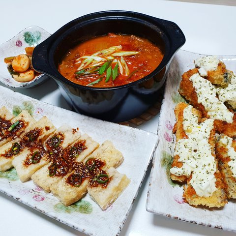 김치찌개,두부부침,수제 연어까스