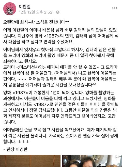 이건 이한열기념사업회 이경란 관장님께서 직접 SNS에 올리신 게시물