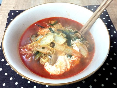 그위에 국물을 따라 주고 마지막으로 건더기들을 면위에 올려줍니다.