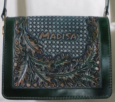 가죽에 도토리 문양을 카빙하고 천연염색하여 제작한 핸드메이드 숄더백입니다.(마디샤-madisaart)
