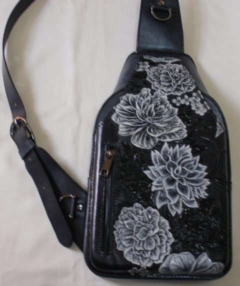 가죽에 플라워 디자인을 카빙하고 페인팅하여 제작한 핸드메이드 바디백입니다.(마디샤-madisaart)