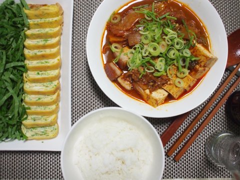 두툼한 삼겹살을 묵은지와 함께 푹 끓여서 계란말이를 곁들인 삼겹살 김치찜.(물음표는 찐따 같으니까 이번에도 빼겠습니다.)