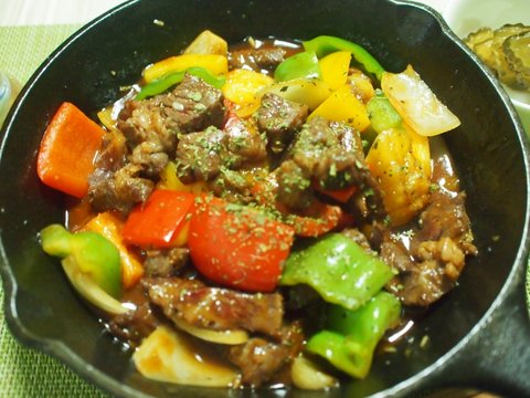 어떤 고기든 챱챱 썰어서 A1소스와 케쳡, 그리고 조금이라도 죄의식을 줄이기 위해 야채를 마구 곁들인 챱스테이크.