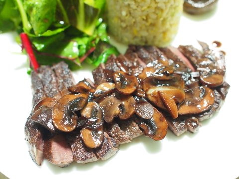 안심을 준비하여 양송이, 와인, 버터 등으로 소스를 가볍게 만들어낸 안심 스테이크