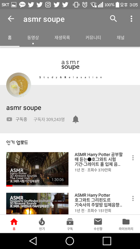 수프님 asmr 개쩔어 ㄹㅇ 이분 구독수 왜캐 적은지 모르겠음 이분은 asmr로 문학 창작하심ㅋㅋ... 해리포터 기숙사부터 시작해서 짱구집 낮잠, 센과 치히로 거미할아버지 방, 메이플스토리 맵, 동물의 숲 카페 등등 아기자기한 컨셉 asmr 만드시는 분임 그 외도 신청하시면 해주심 이분은 만드실 때 스토리보드도 있으심ㅌㅋㅌㅋ 짱구집 같은 경운 처음엔 짱구가 액션가면보는데 갑자기 아빠 와서 야구 중계로 tv 돌리는 거까지 표현하심ㅋㅋㅋㅋㅋ 제발 봐줘