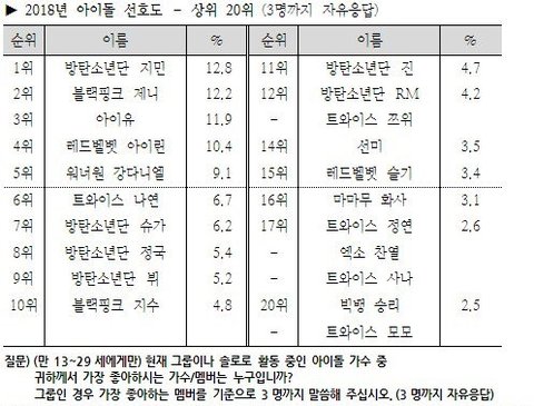 2015년 갤럽조사 시작한 이후로 남돌이 1위를 차치한것은 이번이 처음이래