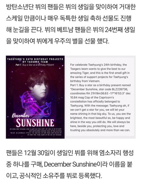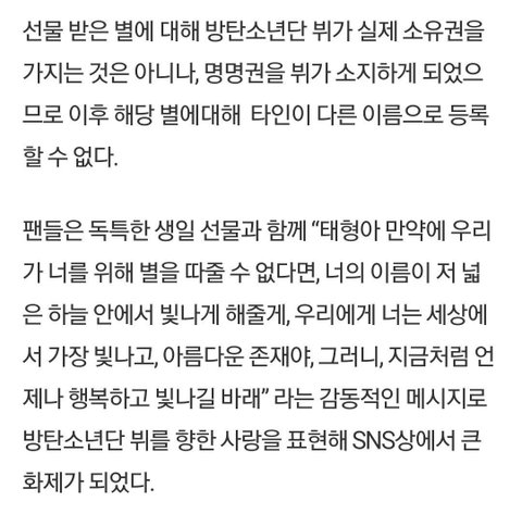 별에 대한 소유권을 가진 것은 아니지만 명명권을 가지게 된 거라 뷔 아니면 해당 별에 대해 이름을 등록할 수 없대 ㄷㄷ