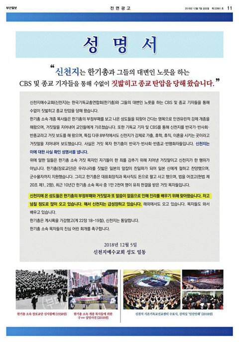 또 “기독교 기자 및 CBS를 통해 신천지를 반국가·반사회·반종교라고