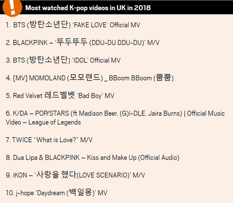 1. BTS(防弹男孩)- ' FAKE LOVE'官方MV 2. BLACKPINK - ' DDU-DU DDU- DU'M / V 3. BTS(防弹男孩) - 'IDOL'官方MV 4. MOMOLAND Momorando ) - BBoom BBoom(吹))5。红色天鹅绒 (红色天鹅绒)- '坏男孩'MV