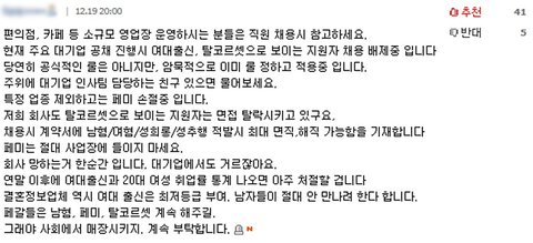 만약 저 글이 사실이라면 한국남성들은 생각보다 더 추악한 거다. 여태까지 불법촬영한 남판사들은 집행유예만 주고 끝났고 여자경찰화장실에 들어가 불법촬영을 저지른 남경찰도 또한 집행유예로 끝났고 직업에 대한 불이익은 없었다. 지금 일베에서 활동하고 있는 남성들 중에는 회사원으로 확인되는 사람들도 있는데 그럼 왜 그 사람들은 차별하지 않는가? 그리고 탈코르셋, 여대를 차별한다는 건 그냥 여자를 거르고 더 거대한 남성중심사회를 세우겠다라는 말로밖에 안들린다