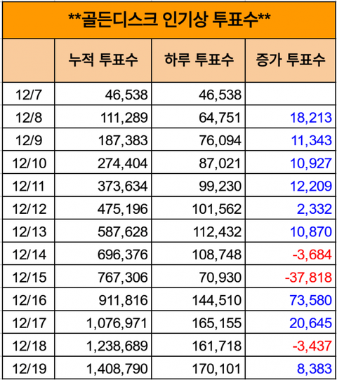 잘하고 있긴 한데 격차 5만 넘게 벌려야 재투표기간에 역전 안당할 수 있대! 화끈하게 격차 벌려놓자 화이팅!!!