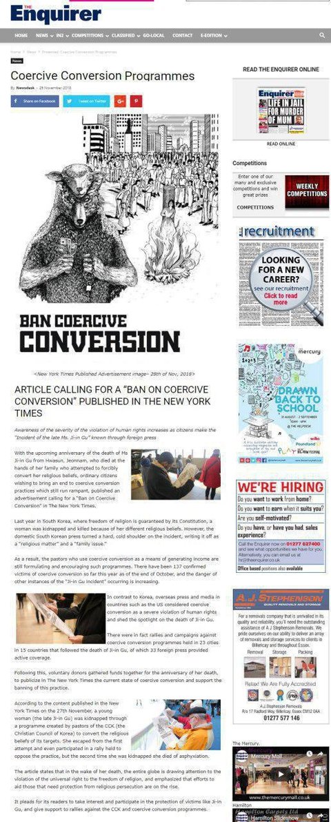 특히 이 매체는 “전시국가나 신흥 국가들에서 종교탄압이 일어나기도 하지만 케이팝(K-Pop)의 고향인 대한민국에서 강제개종에 의한 살인이 발생했다고 생각할 사람은 없을 것”이라며 “한기총과 강제개종에 대항하는 시위를 도울 것과 구지인 씨와 같은 희생자들의 보호에 관심을 가지고 동참해줄 것”을 호소했다.