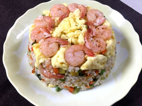 대접에 새우를 가지런히 깔아주고 그위에 먼저 볶아놓은 계란을 얹고
