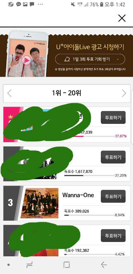 광고영상보면 세번 더 투표 가능 하루 총 여섯번씩 투표가능해