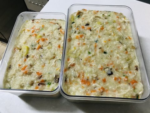 4.남은 닭육수에 불려논 쌀을 넣고 저어가며 익히다가 적당히 익으면 당근,표고버섯 넣고 더 익으면 밤과 쪽파를 제외한 채썬 야채 몽땅 투하