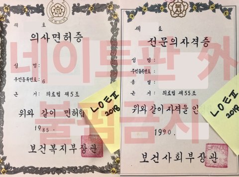 ▶ 의사면허를 85년도에 취득했고 면허증도 그 때 받았었지만, ‘보건사회부’에서 ‘보건복지부’로 명칭이 바뀐 94년 이후 ‘훼손’을 이유로 재발급 받았기 때문에 보건“복지부”장관 이름으로 나왔다고 합니다. 전문의자격증은 90년 보건사회부 시절 당시 발급되었던 것이 맞고요. 오해 없으시길 바랍니다.